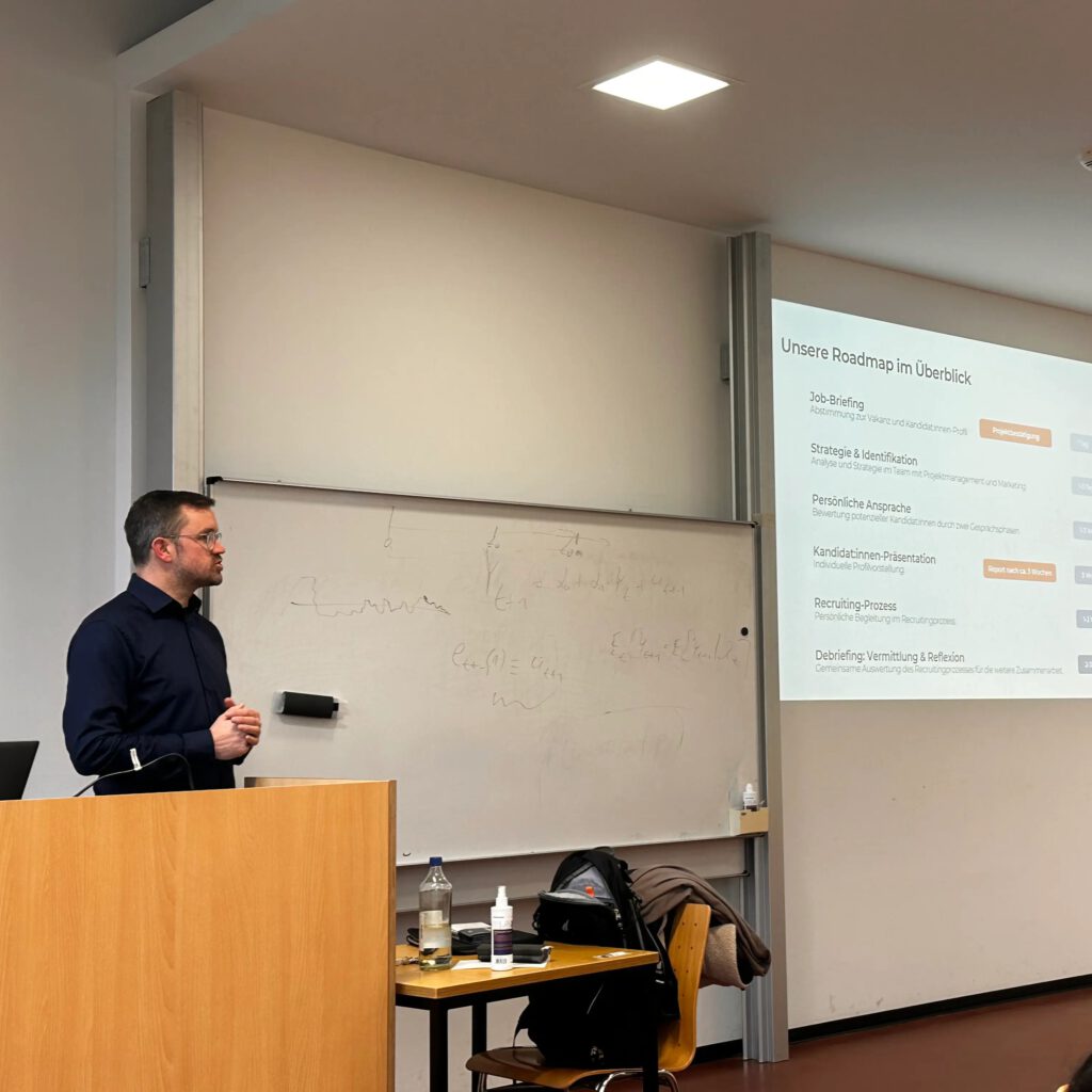 Darüber haben wir im Seminar Personalpolitik und Personalbeschaffung an der Freien Universität Berlin mit den Studierenden von Prof. Dr. Manuel Nicklich gesprochen. Geschäftsführer Daniel Schmökel gab einen ehrlichen Blick in die Praxis unserer Projekte zwischen digitaler Effizienz und persönlicher Beziehungsgestaltung
